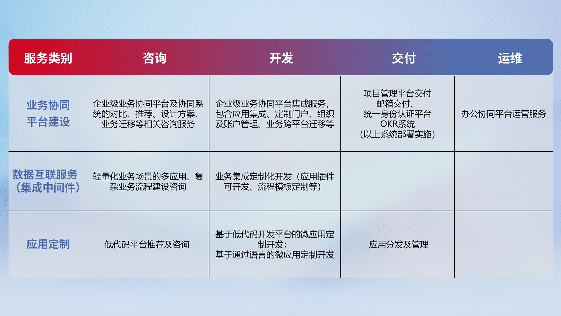 针对钉钉、、企微、、IDaas等平台级产品提供产品的规划、、、、方案、、、交付、、、定制化开发等服务,,,实现如统一协同办公、、智能客户服务、、、混合会议管理、、智能数据查询、、、等业务场景,,,实现数字化转型。。。