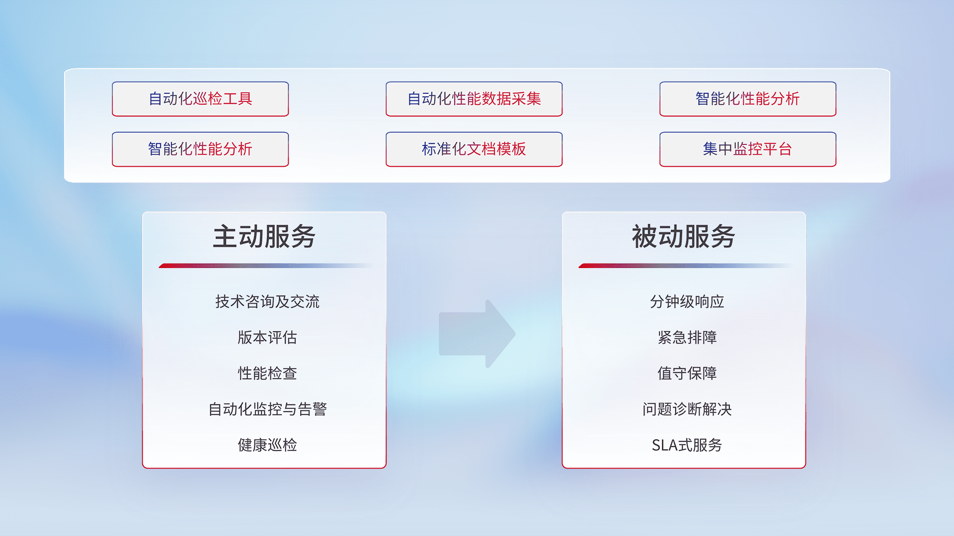 智能化工具和标准化文档,,,保障服务质量,,提供主动服务(包含技术咨询、、、版本评估、、、、性能检查、、、自动化监控与告警、、、、健康巡检)和被动服务包含(分钟级响应、、紧急排障、、值守保障、、问题诊断解决、、SLA服务)。。