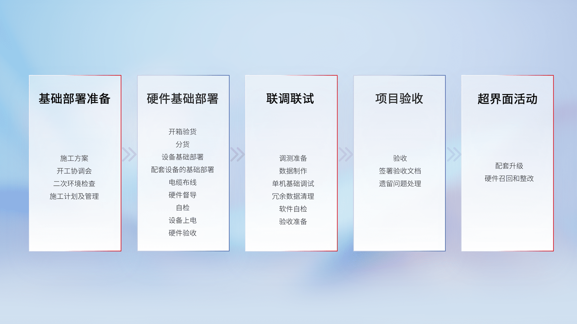 从基础部署准备、、硬件基础部署、、联调联试、、项目验收、、越界面活动的全过程可追溯,,保证施工质量和进度。。。。