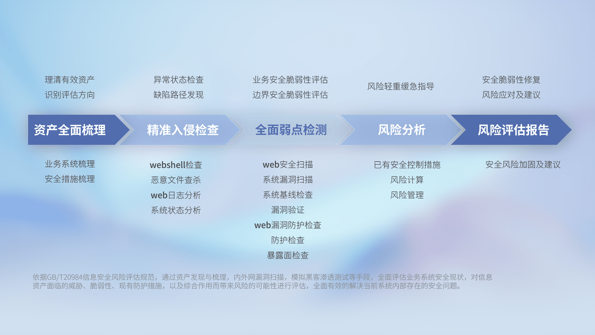针对客户行业特性,,,,以专业的安全服务+多厂商联合解决方案提供专属的一站式安全管理服务,,帮助客户全面感知网络空间威胁,,,基于识别、、检测、、分析、、、防护、、、、监测、、、响应的服务理论模型,,,从方案咨询、、集成交付、、评估验证、、、优化加固、、、、运维运营,,致力于为客户提供完整的闭环管理式安全服务。。。。以实战经验为客户打造高抵御风险的安全体系,,,帮助客户发现威胁、、、对抗威胁、、处置威胁,,,,不断积累安全对抗能力,,,,持续保障数字化安全。。。